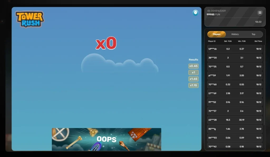 La ripetitività nelle sessioni lunghe. Dopo 10-15 partite, i primi piani diventano routine. Solo i bonus spezzano il ritmo. Un sistema di ambienti evolutivi, sfide temporanee o una modalità multiplayer competitiva in tempo reale mancano chiaramente. Il pannello laterale mostra lo storico degli altri giocatori ma non c’è interazione reale.